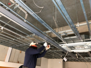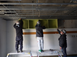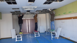 ①解体工事 パーテーションの下地補強、消防電気設備の増設があるので天井を解体します。