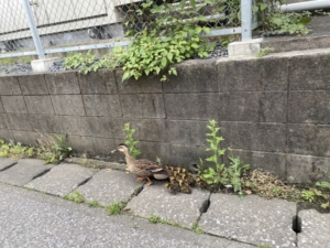 玄関先で社長の呼び声が!「みんな早く来て~~~、鴨が!鴨が!!道を歩いてるよ~~~」