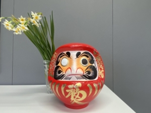 仕事始めの日に、みんなで目をいれた達磨さんと一緒に記念撮影をしました。