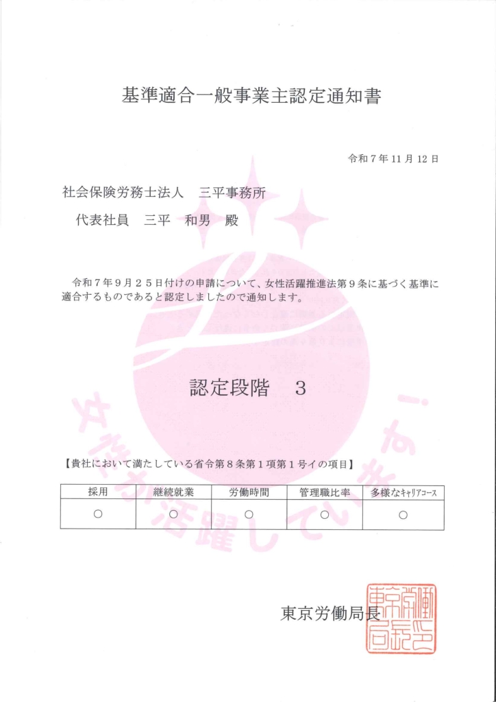 三平事務所は、女性の活躍支援に積極的に取り組む企業として、2025年11月12日付で厚生労働省より「えるぼし認定」(認