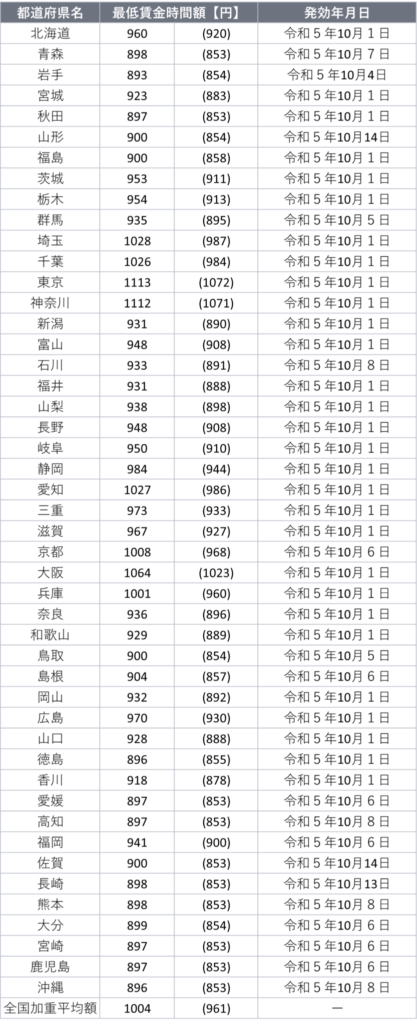 ニュース・お知らせ 令和5年度地域別最低賃金改定状況 2023年9月21日 最低賃金が改定されます。 都道府県の令和5年度地域別最低賃金額及び発効年月日は、以下のとおりです。 情報/厚生労働省 投稿ナビゲーション < 前の記事へ次の記事へ >